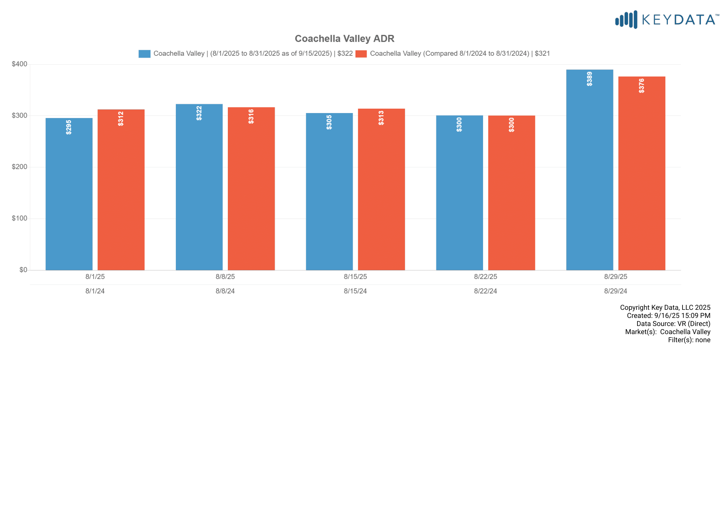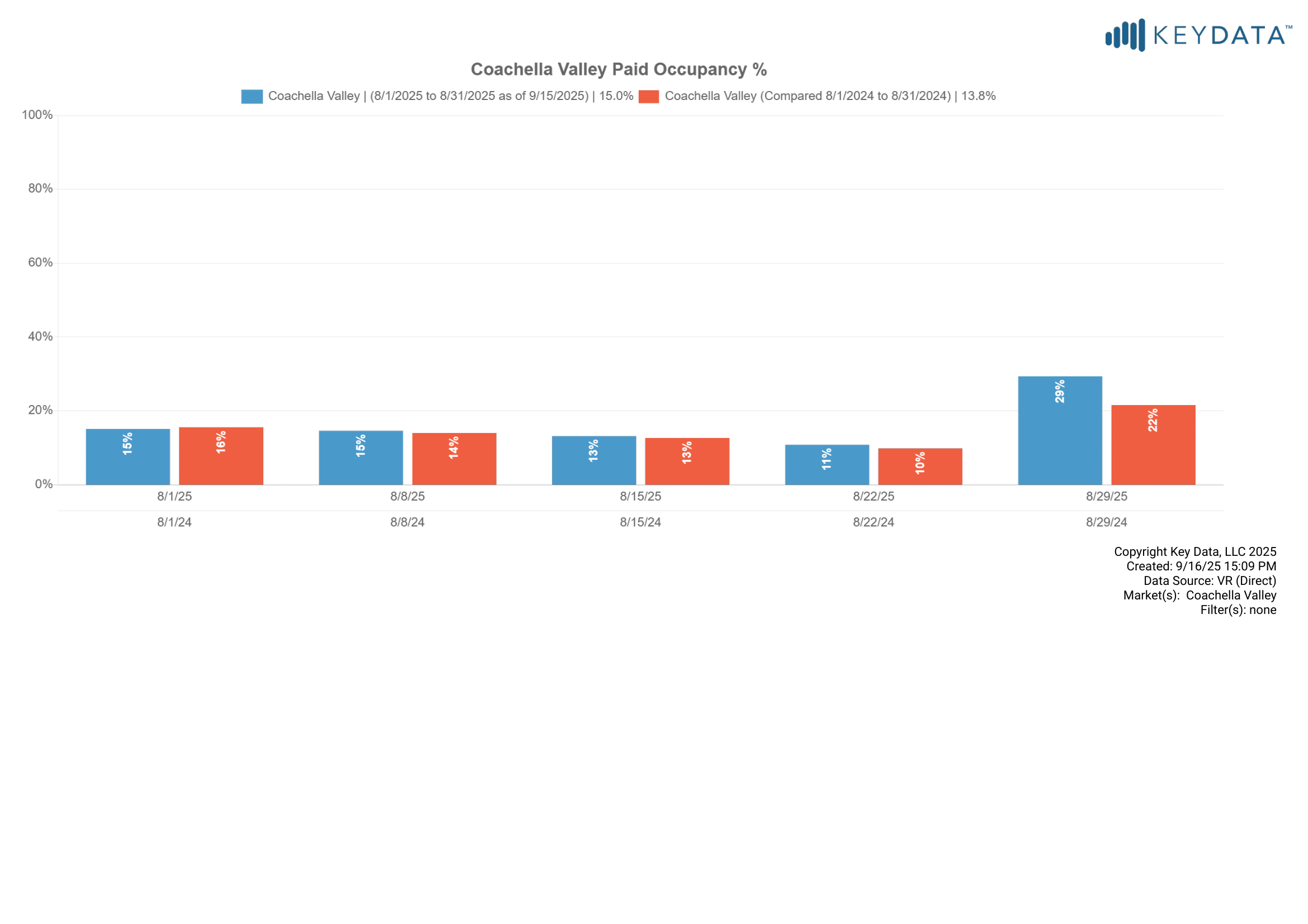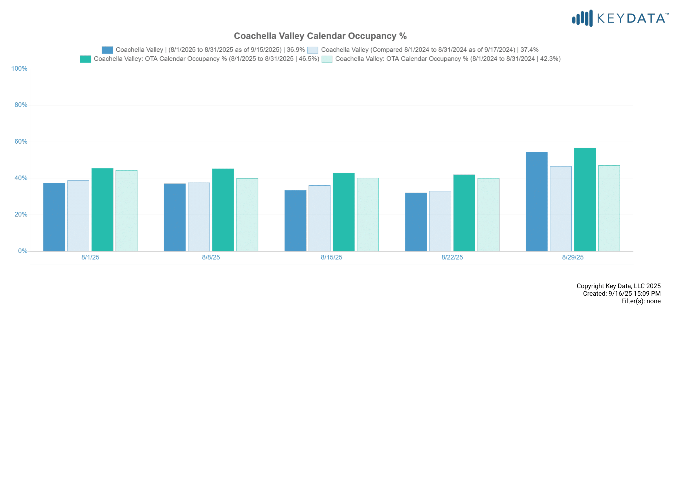 OTA calendar occupancy was 46.5% for August 2025, compared to 42.3% in 2024. Note, the graph also includes professionally managed “calendar occupancy,” which includes dates occupied by owners, maintenance holds, and other non-paid calendar blocks. OTA calendars do not indicate whether reservations are paid guest stays or non-paid calendar blocks.