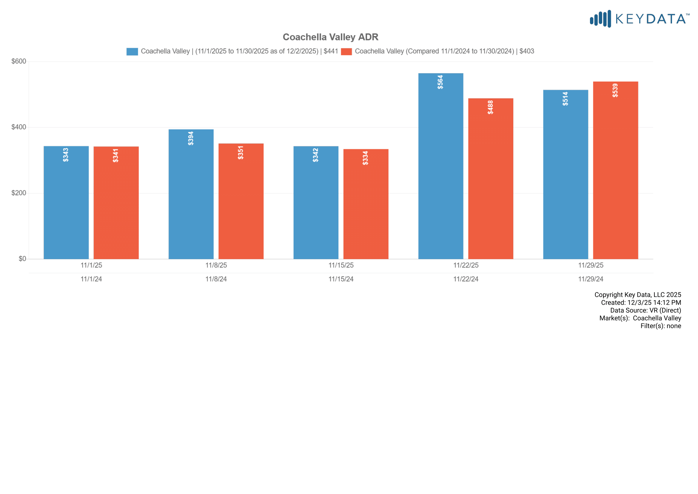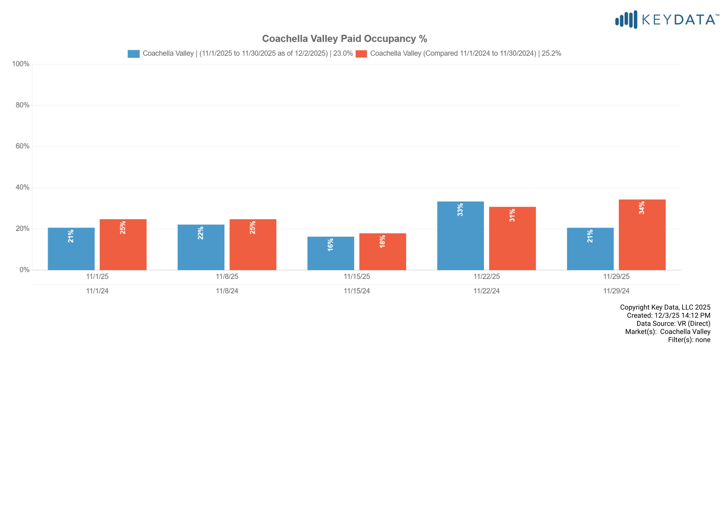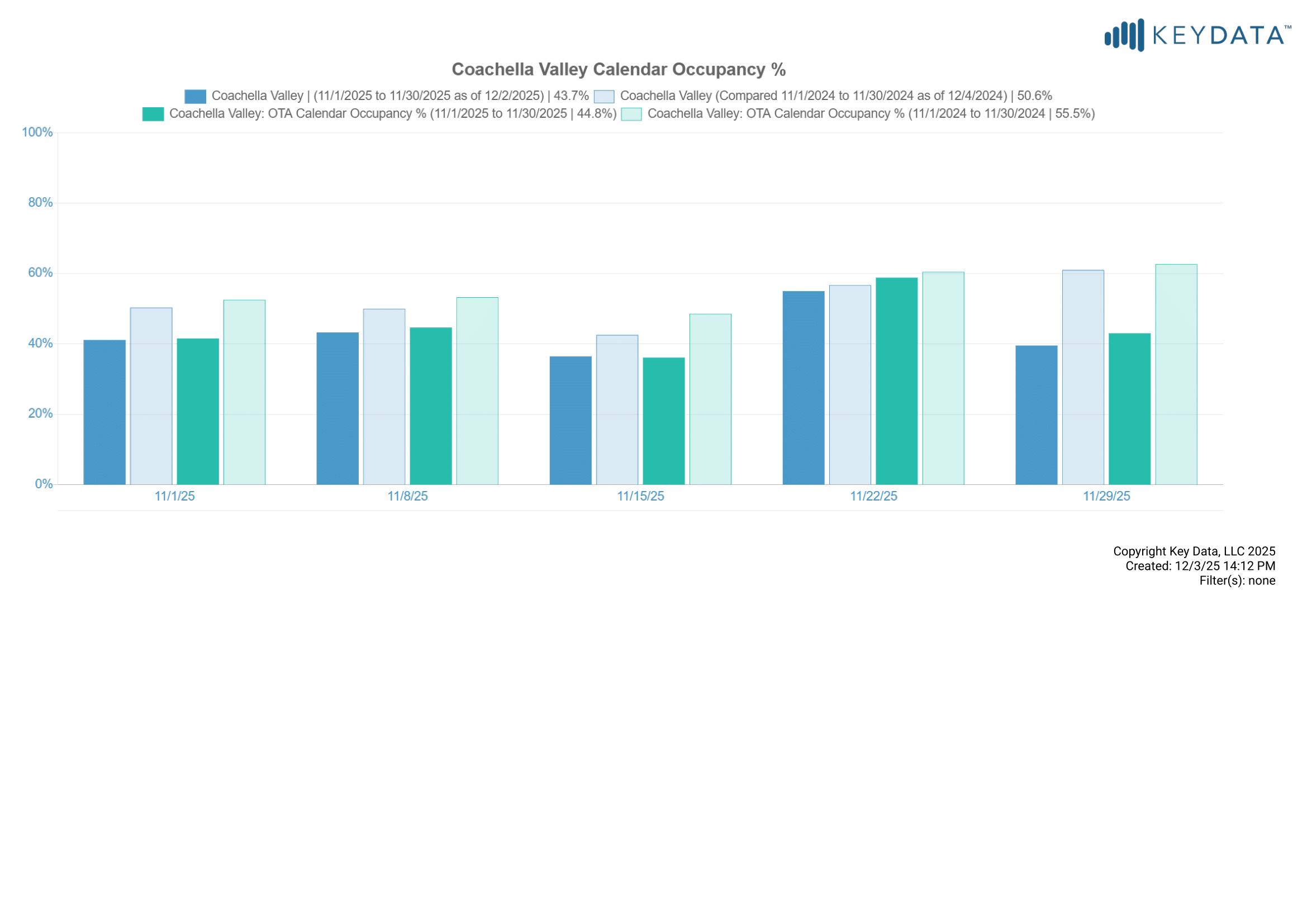 OTA calendar occupancy was 44.8% for November 2025, compared to 55.5% in 2024. Note, the graph below also includes professionally managed “calendar occupancy” which includes dates occupied by owners, maintenance holds and other non-paid calendar blocks. OTA calendars do not indicate whether reservations are paid guest stays or non-paid calendar blocks.