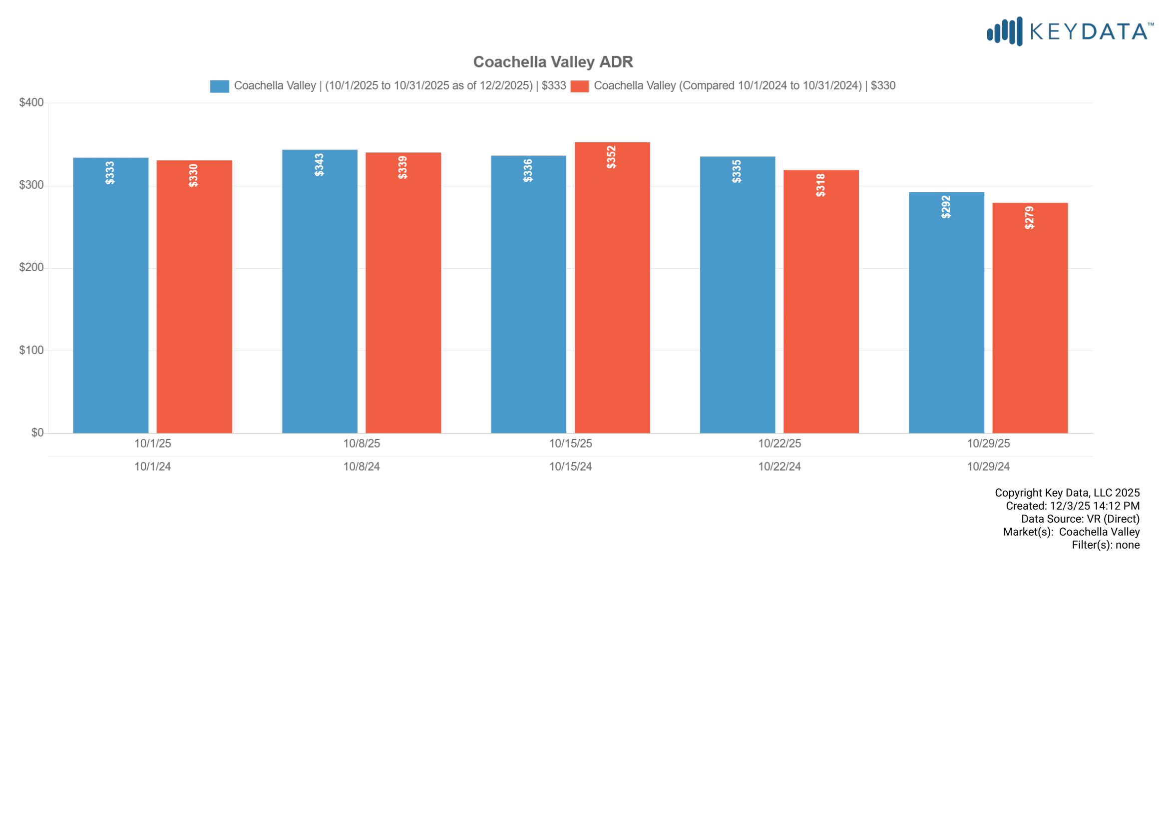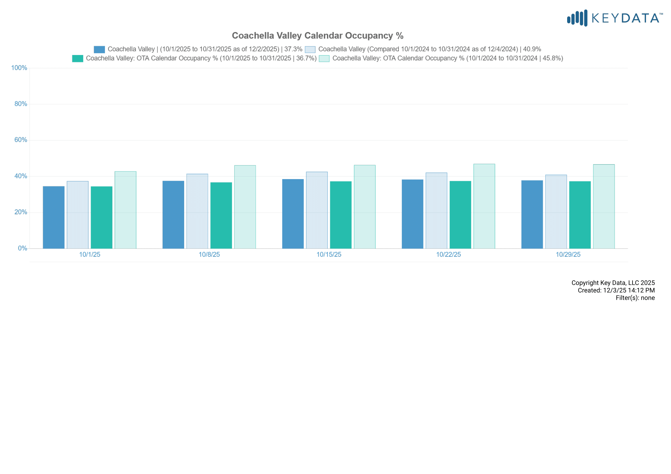 OTA calendar occupancy was 36.7% for October 2025, compared to 45.8% in 2024. Note, the graph below also includes professionally managed “calendar occupancy” which includes dates occupied by owners, maintenance holds and other non-paid calendar blocks. OTA calendars do not indicate whether reservations are paid guest stays or non-paid calendar blocks.