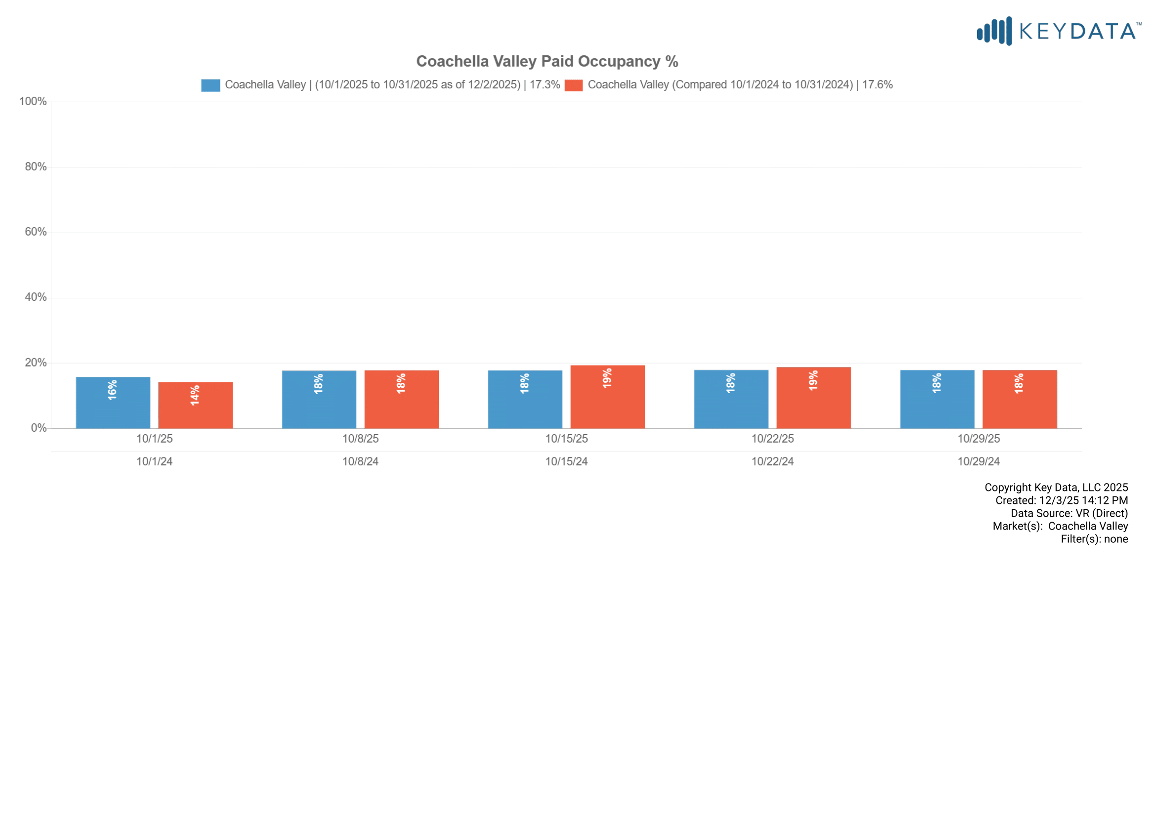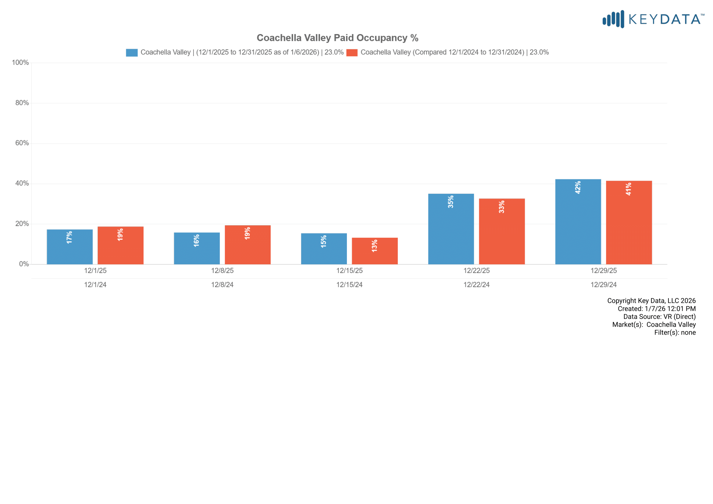 OTA calendar occupancy was 47.4% for December 2025, compared to 55.3% in 2024. Note, the graph below also includes professionally managed “calendar occupancy” which includes dates occupied by owners, maintenance holds and other non-paid calendar blocks. OTA calendars do not indicate whether reservations are paid guest stays or non-paid calendar blocks.