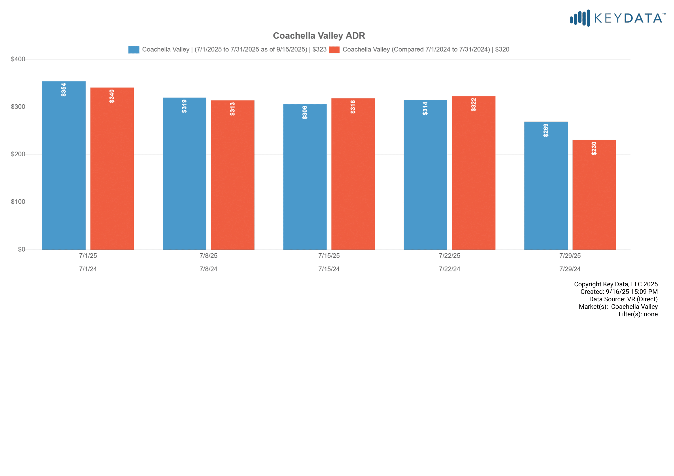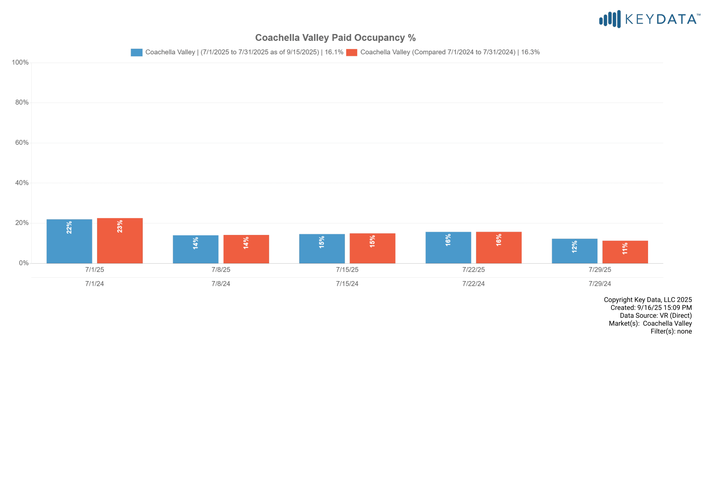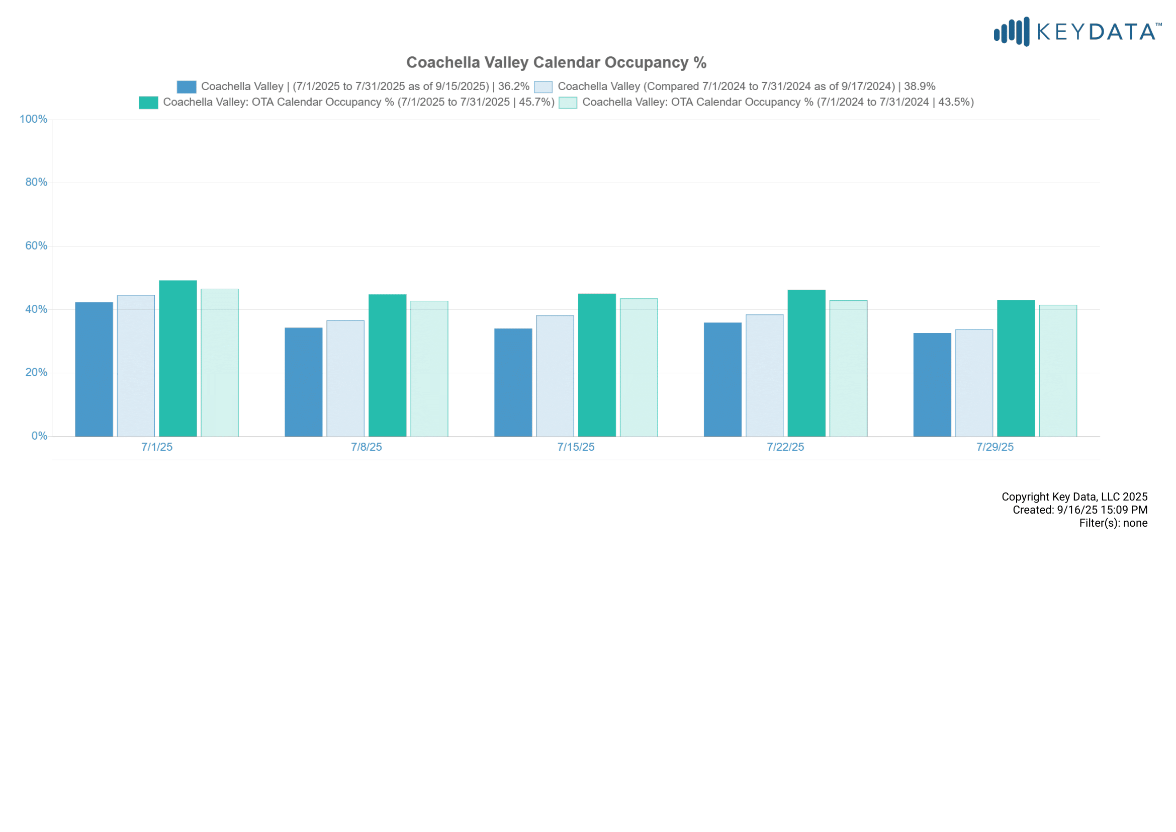 OTA calendar occupancy was 45.7% for July 2025, compared to 43.5% in 2024. Note, the graph also includes professionally managed “calendar occupancy,” which includes dates occupied by owners, maintenance holds, and other non-paid calendar blocks. OTA calendars do not indicate whether reservations are paid guest stays or non-paid calendar blocks.
