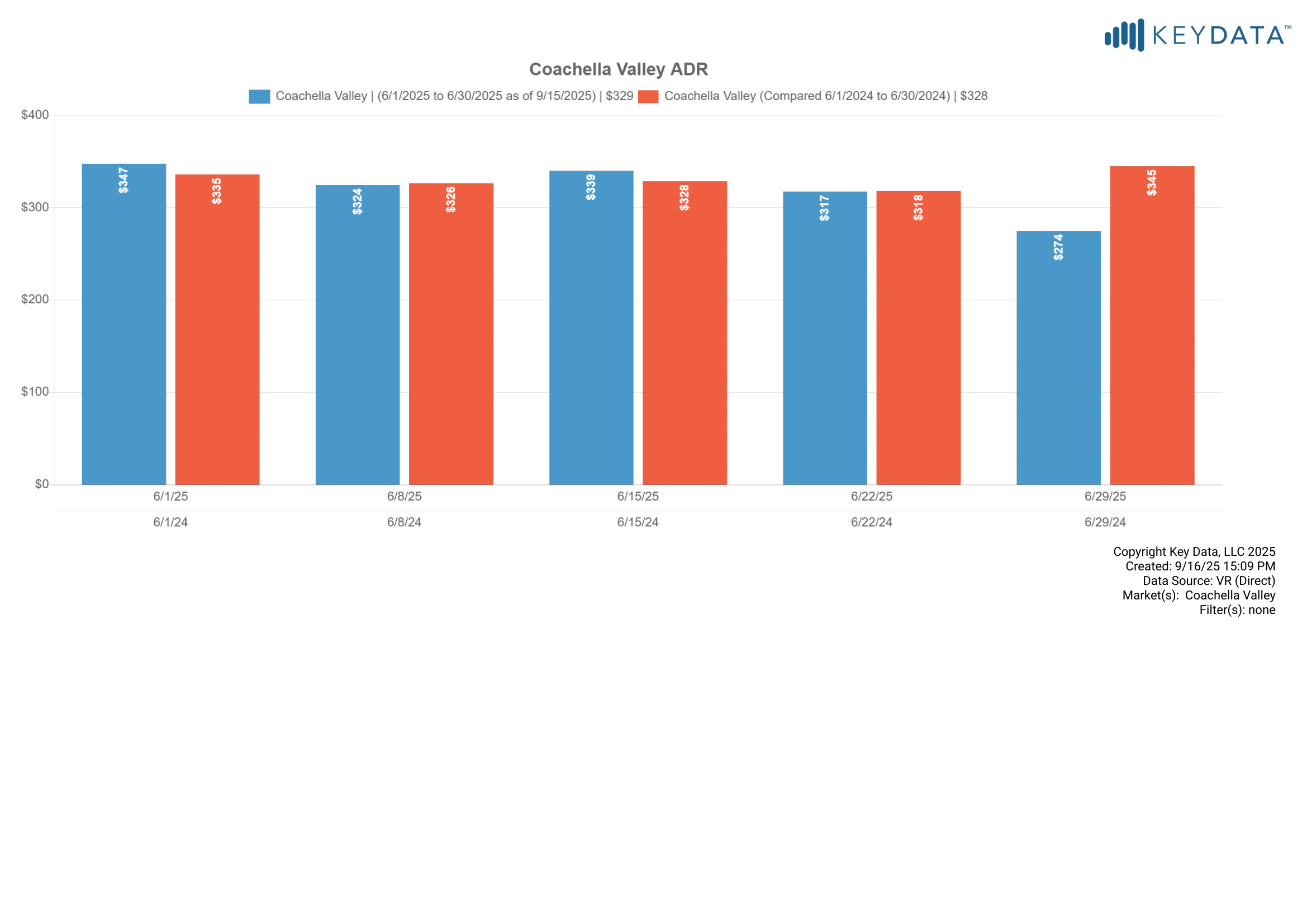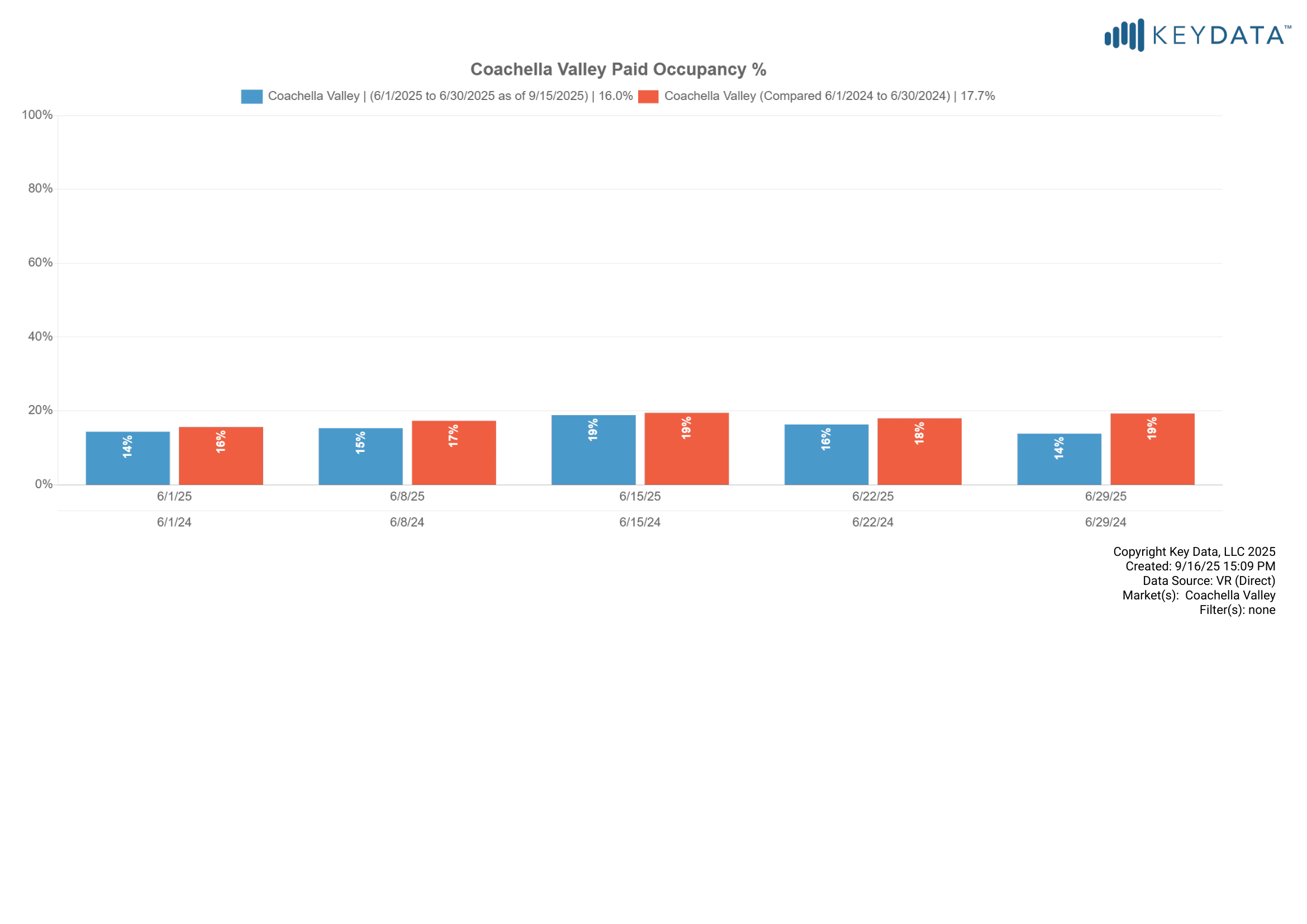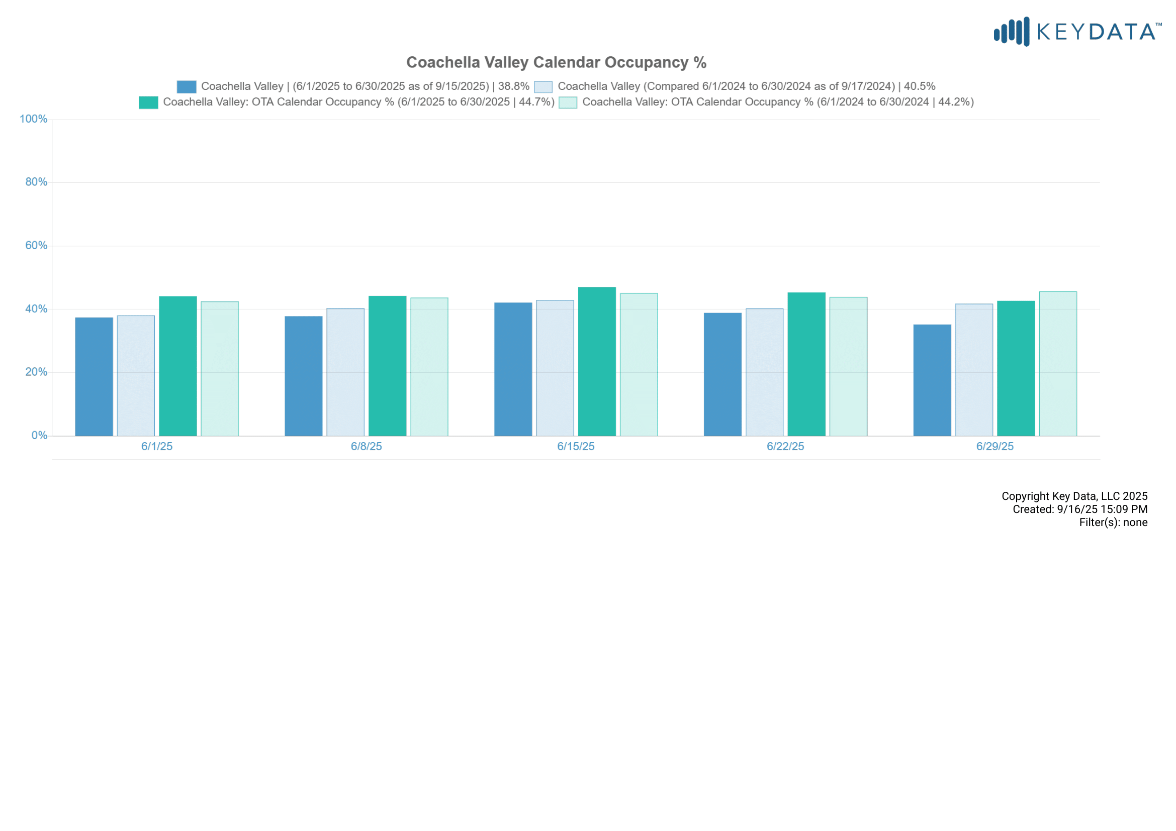 OTA calendar occupancy was 44.7% for June 2025, compared to 44.2% in 2024. Note, the graph also includes professionally managed “calendar occupancy,” which includes dates occupied by owners, maintenance holds, and other non-paid calendar blocks. OTA calendars do not indicate whether reservations are paid guest stays or non-paid calendar blocks.